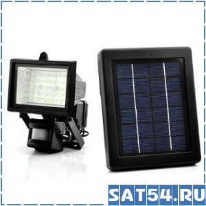 Прожектор оснащен мощным аккумулятором (8 часов автономной работы, 2000 мА/ч) и 60-ю яркими светодиодами. Фотопанель выдает напряжение 9 В при 3 Вт мощности. Эта модель оснащена датчиком освещения, и когда наступает ночь прожектор включается автоматически.