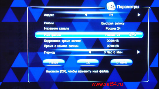 Нажимаем кнопку с красным кругляшком еще раз и только тогда на экран телевизора выводится меню настроек записи. Здесь задается два параметра. Первый из них время записи. В меню читать - период.