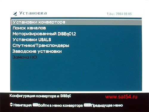 Пальцы интуитивно жмут курсор на пульте дистанционного управления в сторону раздела "Установка". Дизайн меню никаких изменений не претерпел. Уж слишком он уж приелся. Могли что-нибудь и пооригинальнее придумать. Посмотрите на стартовую дату в ресивере (верхний правый угол). Правильно 2004 год - это год разработки этого меню. С тех пор не было никаких глобальных изменений. А все изменения, которые в меню будут, выполнены в другом цветовом решении. Странный подход.